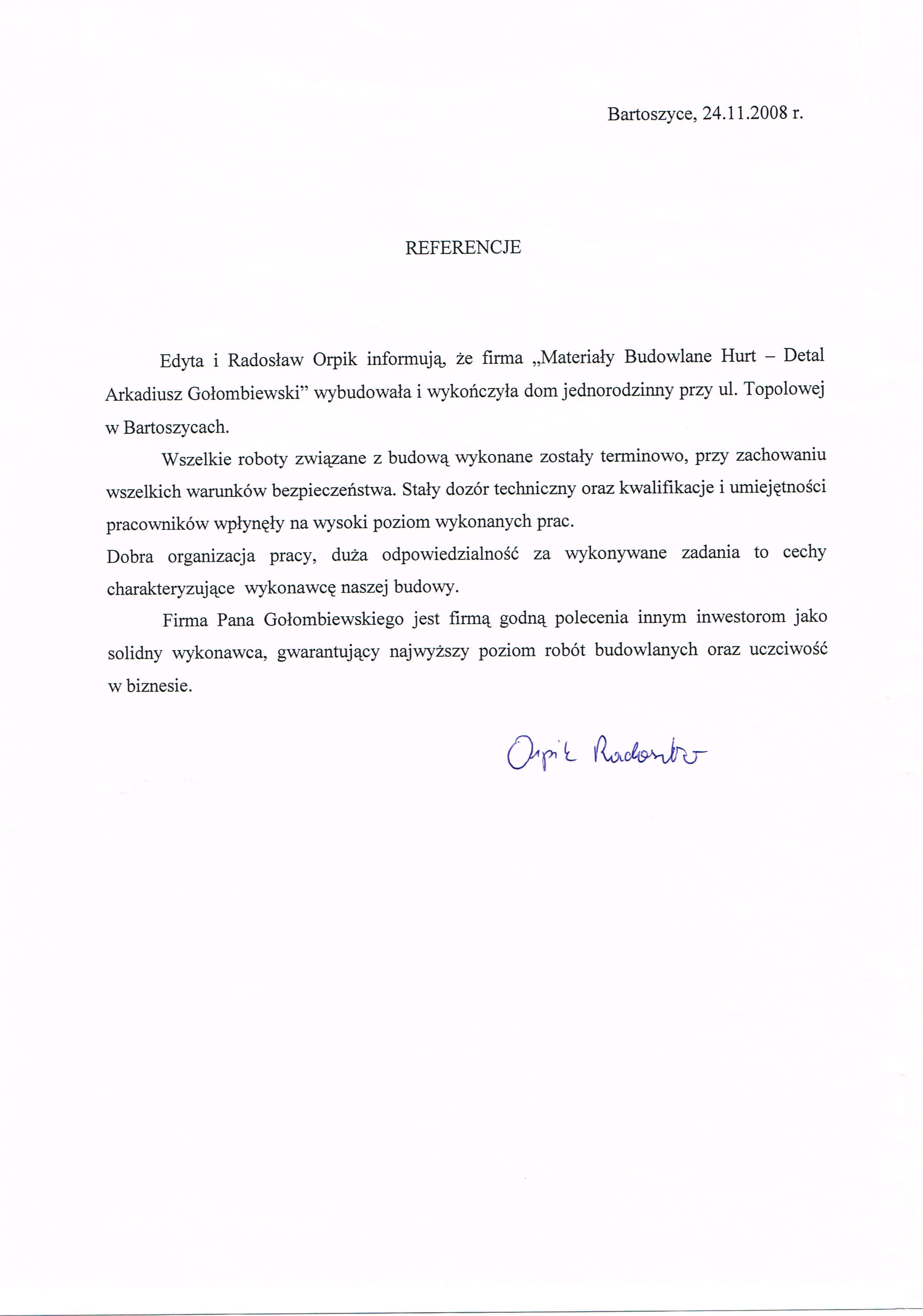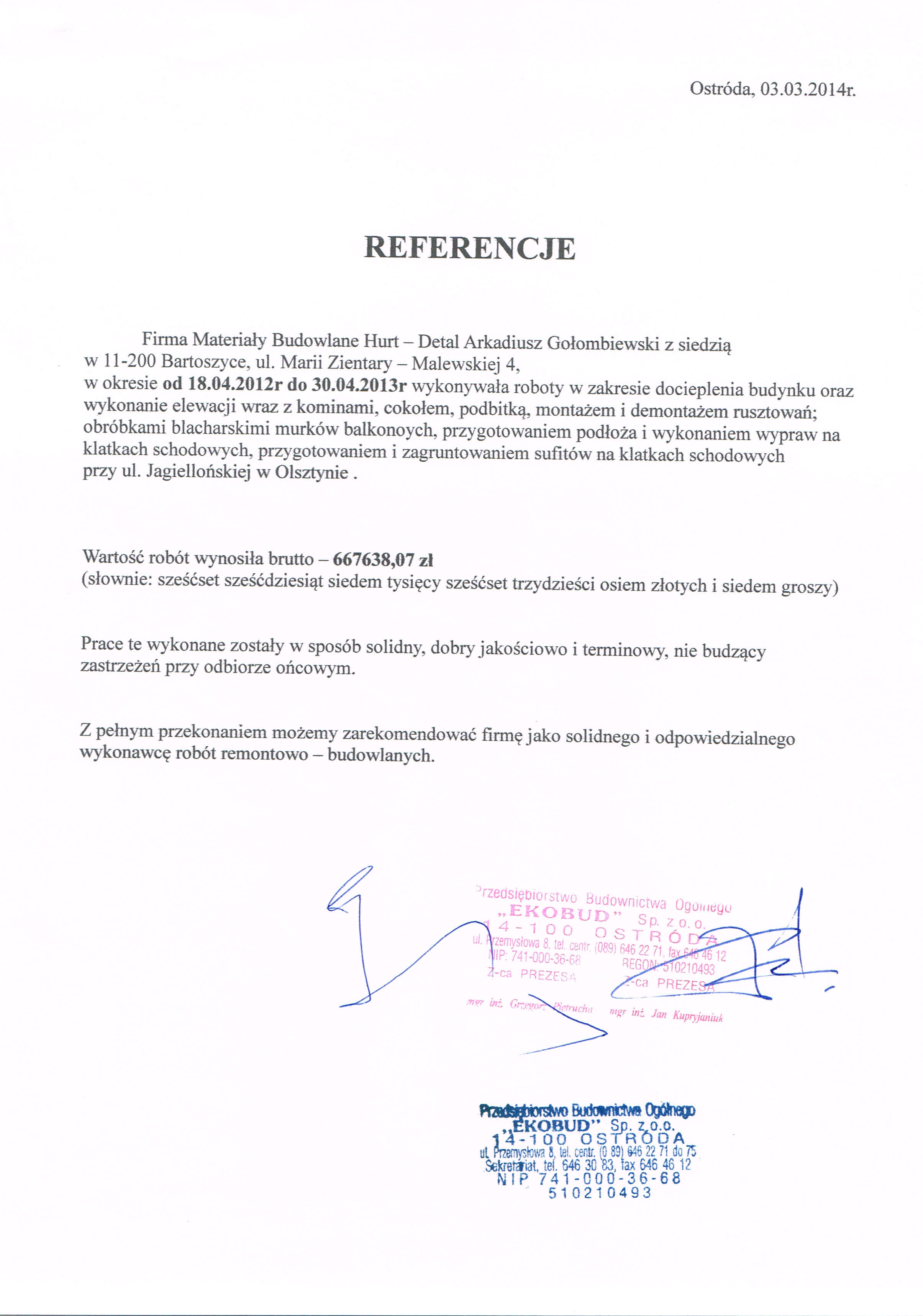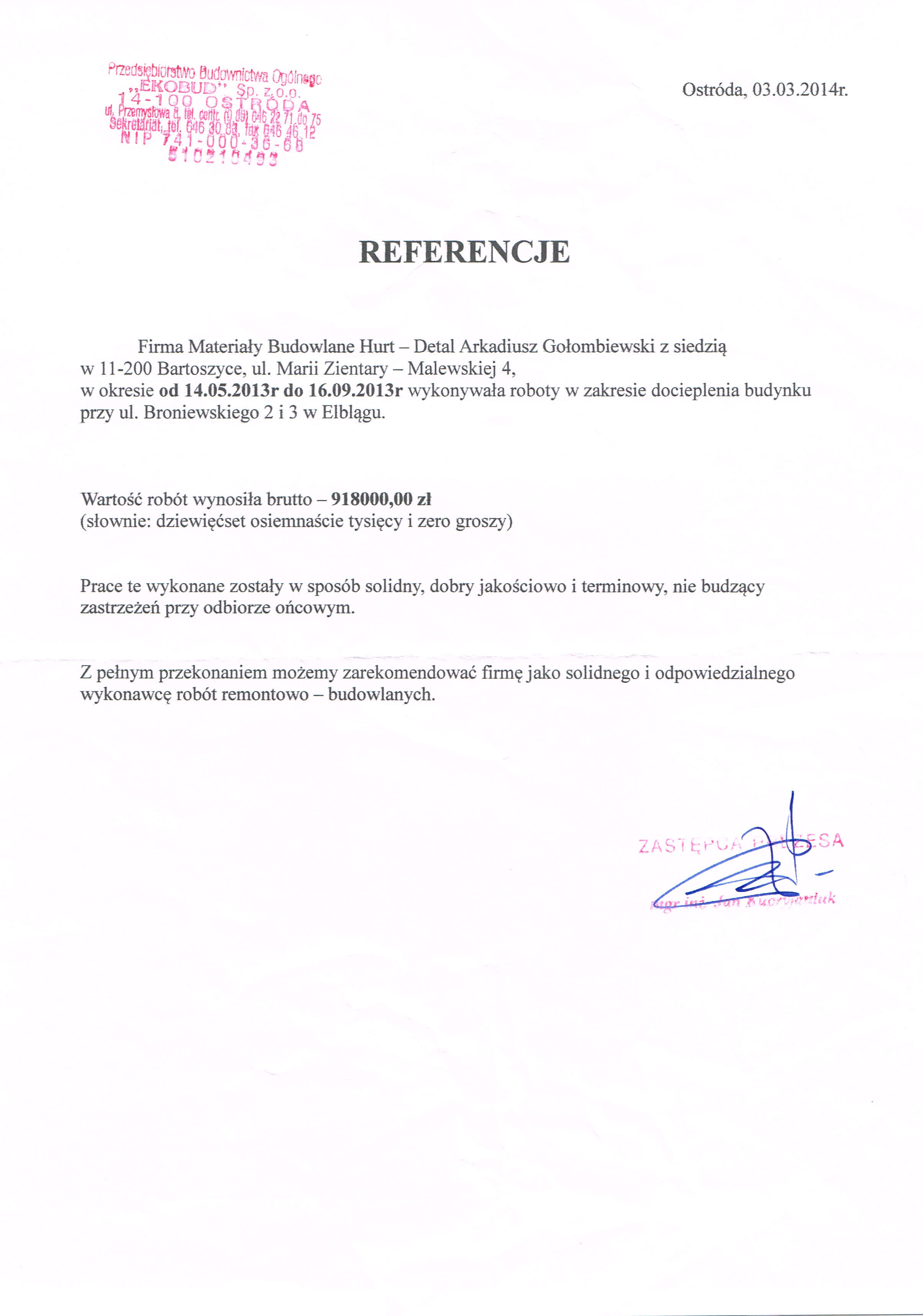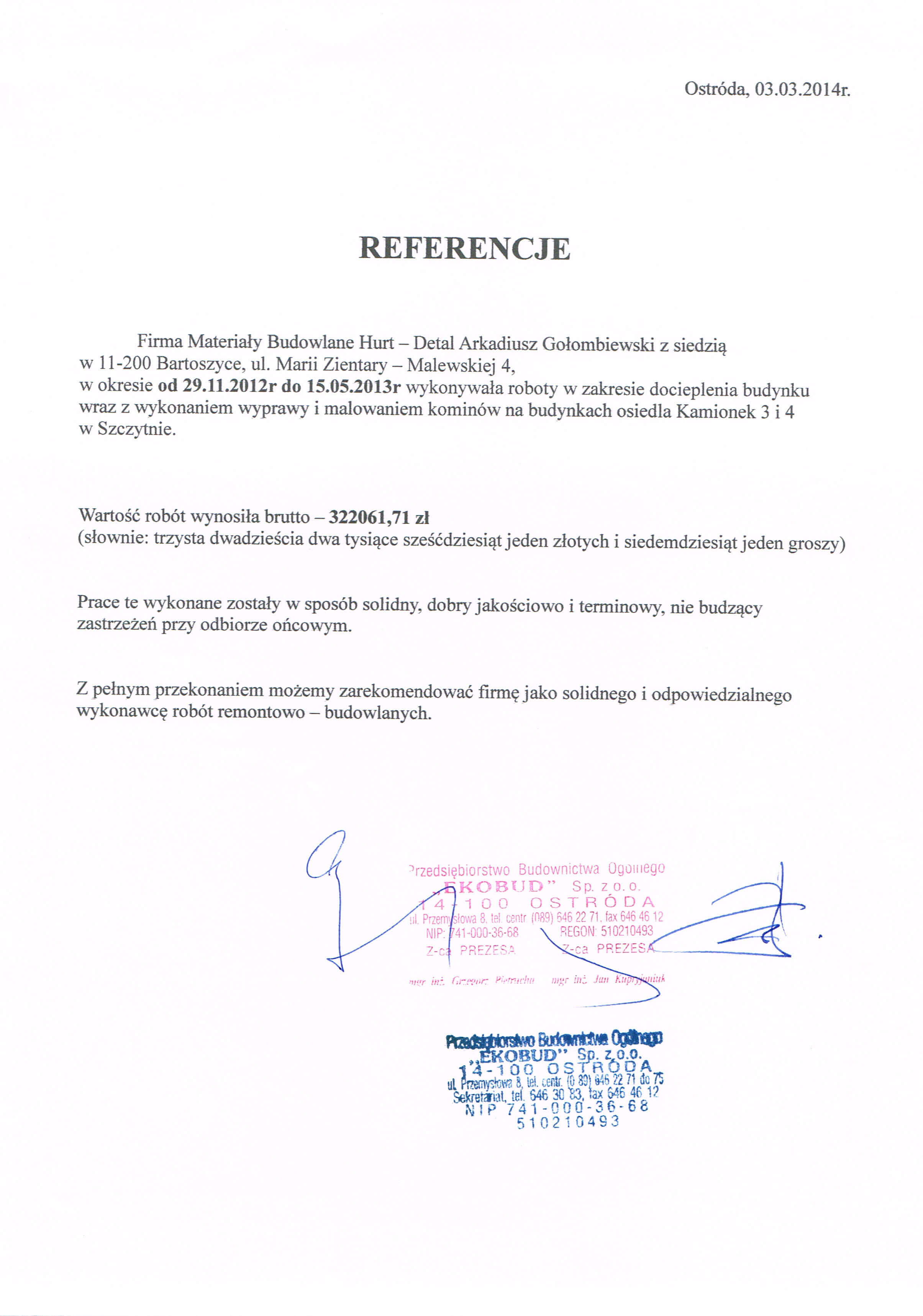 Na poniższej podstronie internetowej znajdą Państwo przykładowe referencje od zadowolonych Klientów na temat wykonywanych przez nas prac i zleceń. Realizujemy usługi zarówno dla osób prywatnych, jak i firm oraz instytucji, dlatego też prezentujemy opinie od wielu Klientów. Jako że specjalizacją naszej firmy jest izolacja pianką poliuretanową, opinie na temat realizacji owej usługi będą jednymi z najczęściej występujących pośród naszych referencji. Opinii (zazwyczaj pochlebnych) na temat konkretnych firm znaleźć można w internecie mnóstwo – na forach, blogach lub pod różnego rodzaju artykułami w serwisach online. W sieci każdy może niemal bez przeszkód podzielić się swoją wypowiedzią na dowolny temat. Na stronach internetowych dostępne są też nierzadko sprzeczne ze sobą informacje. Dlatego tak ważna jest weryfikacja rzetelnych i sprawdzonych opinii od osób poświadczających referencje swym prawdziwym imieniem i nazwiskiem.